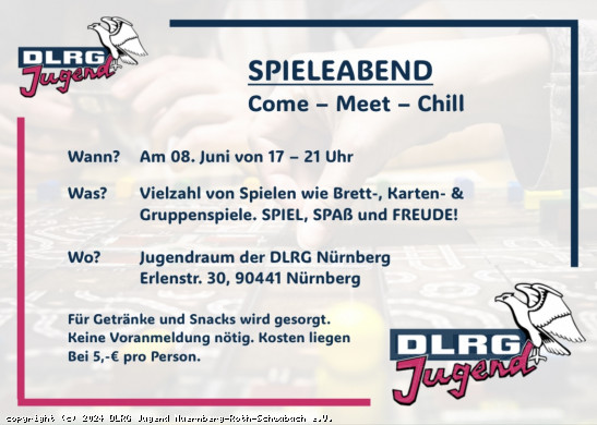 Am 08.06.2024 ab 17 Uhr veranstalten wir einen Spieleabend. Das bedeutet eine Menge Spaß und die Möglichkeit neue Leute kennenzulernen! Neben viel Zeit zum gegenseitigen Kennenlernen wird es auch eine Vielzahl von Spielen, darunter Brett-, Karten- und Gruppenspielen geben. Snacks und Getränke werden zur Verfügung gestellt. Treffpunkt ist um 17:00 Uhr im Jugendraum der DLRG Nürnberg (Erlenstraße 30, 90441 Nürnberg). Ihr könnt kommen und gehen wir ihr Zeit und Lust habt. Spätestens um 21 Uhr machen wir Feierabend. Kosten liegen bei 5,-€ pro Person. Wir freuen uns auf euch! Euer Jugendvorstand ... Mehr erfahren
